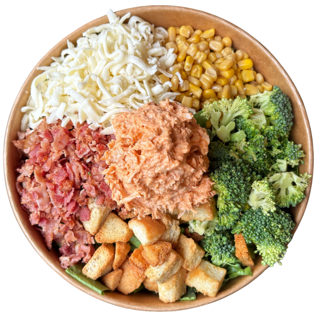 Laitue romaine, tartinade de poulet buffalo, maïs, brocoli, croûtons, bacon et mozzarella